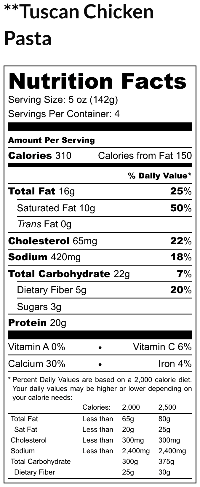 Ingredients: Pasta [durum wheat flour, semolina), Parmesan (pasteurized milk, cheese cultures, salt, enzymes), Chicken, Cream Cheese (milk, cheese cultures, salt), Sun Dried Tomatoes (sun dried tomato strips, glucose, salt, citric acid), Red Peppers (red peppers, water, salt, citric acid), Butter (cream, natural flavor), Garlic, Salt, Basil, Pepper