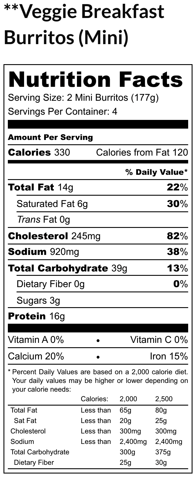 Our tasty, healthy veggie breakfast burritos will give you a fresh, energized start to your day. Wrapped in a flour tortilla - peppers, onions, spinach, and melted cheddar cheese are just what you need for a quick breakfast on the go. Just grab one from the freezer and microwave for 1-2 minutes. Or, bake in the oven for a crispier finish.