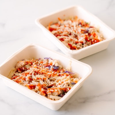 Ingredients: Ground Pork, Cabbage, Carrots, Vegetable Stock (water, salt, organic carrot juice concentrate, organic sugar, organic onion juice concentrate, organic celeriac juice concentrate, yeast extract), Gluten Free Tamari (water, soybeans, sugar, salt, vinegar, alcohol, lactic acid), Sesame Oil, Garlic, Ginger