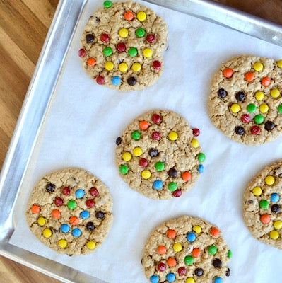 Ingredients: Whole Grain Rolled Oats, Peanut Butter (roasted peanuts, sugar, palm oil, sea salt), Salted Butter, Brown Sugar, Granulated Sugar, Eggs, Baking Soda, Vanilla, Maple Syrup, M&M Candy (milk chocolate (sugar, chocolate, skim milk, cocoa butter, lactose, milkfat, soy lecithin, salt, artificial flavors), Sugar, Less Than 2% - Coloring (includes blue 1 lake, red 40, yellow 6, yellow 5, blue 1, yellow 5 lake, red 40 lake, yellow 6 lake, blue 2 lake, blue 2), dextrin, corn syrup, cornstarch)