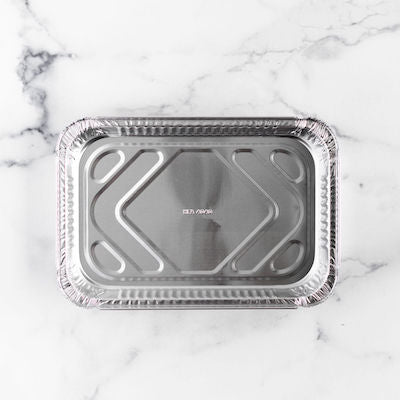 A small meal contains eight sliders and is packaged in a 7x12 foil container. A large meal contains twelve sliders and is packaged in a 8x12 foil container.