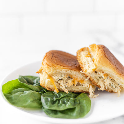 Ingredients: Slider Rolls (enriched flour (wheat flour, malted barley flour, niacin, reduced iron, thiamine mononitrate, riboflavin, folic acid), water, sugar, butter (pasteurized cream, salt), eggs, contains less than 2 % of the following: potato flour, yeast, whey, nonfat milk, soy flour, salt, degerminated yellow corn flour, wheat gluten, sodium stearoyl lactylate, monocalcium phosphate, wheat flour, calcium sulfate, sodium silicoaluminate, ascorbic acid, ammonium sulfate, wheat starch, sorbitan monostearate, enzymes, microcrystalline cellulose, calcium silicate), Chicken, Cream Cheese (milk, cheese cultures, salt), Cheddar (cultured pasteurized milk, salt, enzymes, annatto, anticaking blend (potato starch, cellulose, natamycin), Bacon, Green Onion, Butter, Ranch Seasoning (parsley, garlic powder, onion powder, dill, salt, pepper)