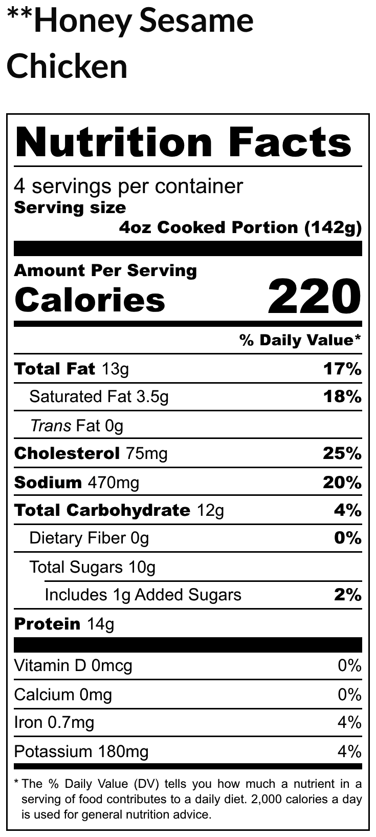 This healthier version of a Chinese takeout favorite features tender chicken pieces with our sweet and savory honey sesame sauce. Pair with rice and your favorite steamed vegetables for an easy weeknight dinner, riced cauliflower, or skip the rice for a simple lower-carb option.