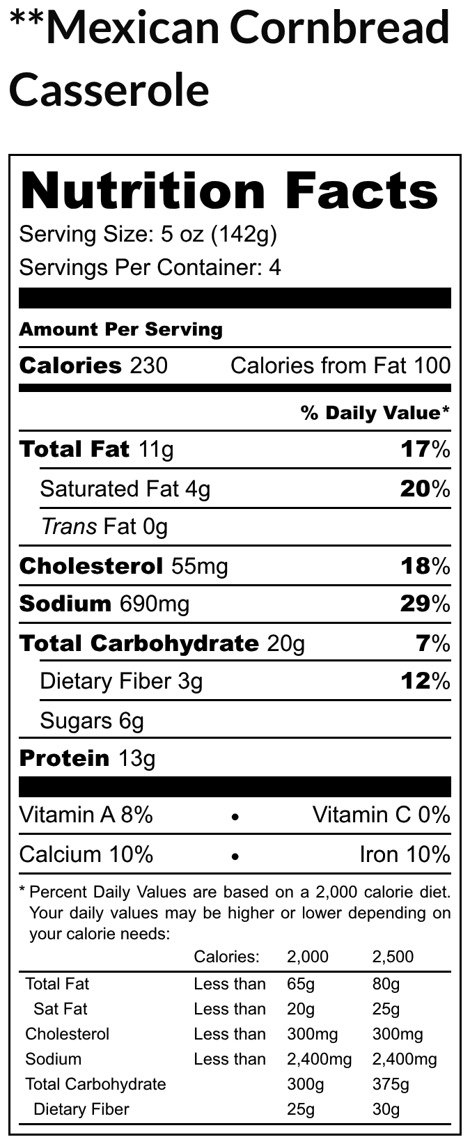 Ingredients: Beef, Rotel (tomatoes green chili peppers, less than 2% of: salt, calcium chloride, natural flavor, citric acid, cilantro), Cheddar (cultured pasteurized milk, salt, enzymes, annatto, anticaking blend (potato starch, cellulose, natamycin), Corn, Milk (pasteurized reduced fat milk, vitamin a palmitate, vitamin d3), Cornmeal, Flour (organic wheat), Egg, Avocado Oil, Sugar, Taco seasoning (chili powder, cumin, garlic powder, onion powder, oregano, paprika, pepper, salt), Baking Powder, Salt