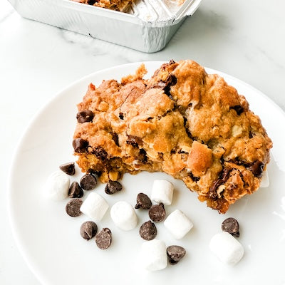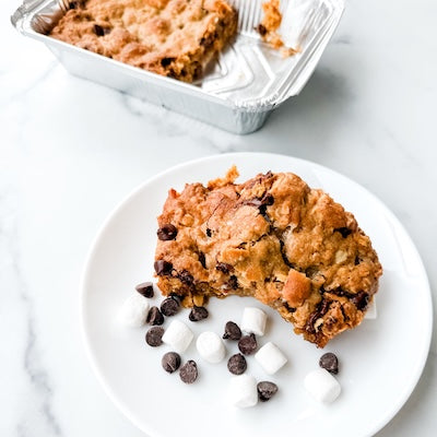 Ingredients: Oats, Flour (organic wheat), Butter, Brown Sugar, Semi-Sweet Chocolate (sugar, chocolate, cocoa butter, milk fat, soy lecithin, vanillin, artificial flavor, milk), Egg, Marshmallows (corn syrup, sugar, modified cornstarch, dextrose, water, contains less than 2% of gelatin, tetrasodium pyrophosphate (whipping aid), natural and artificial flavor, blue 1), Baking Soda, Salt