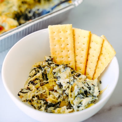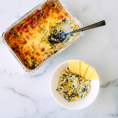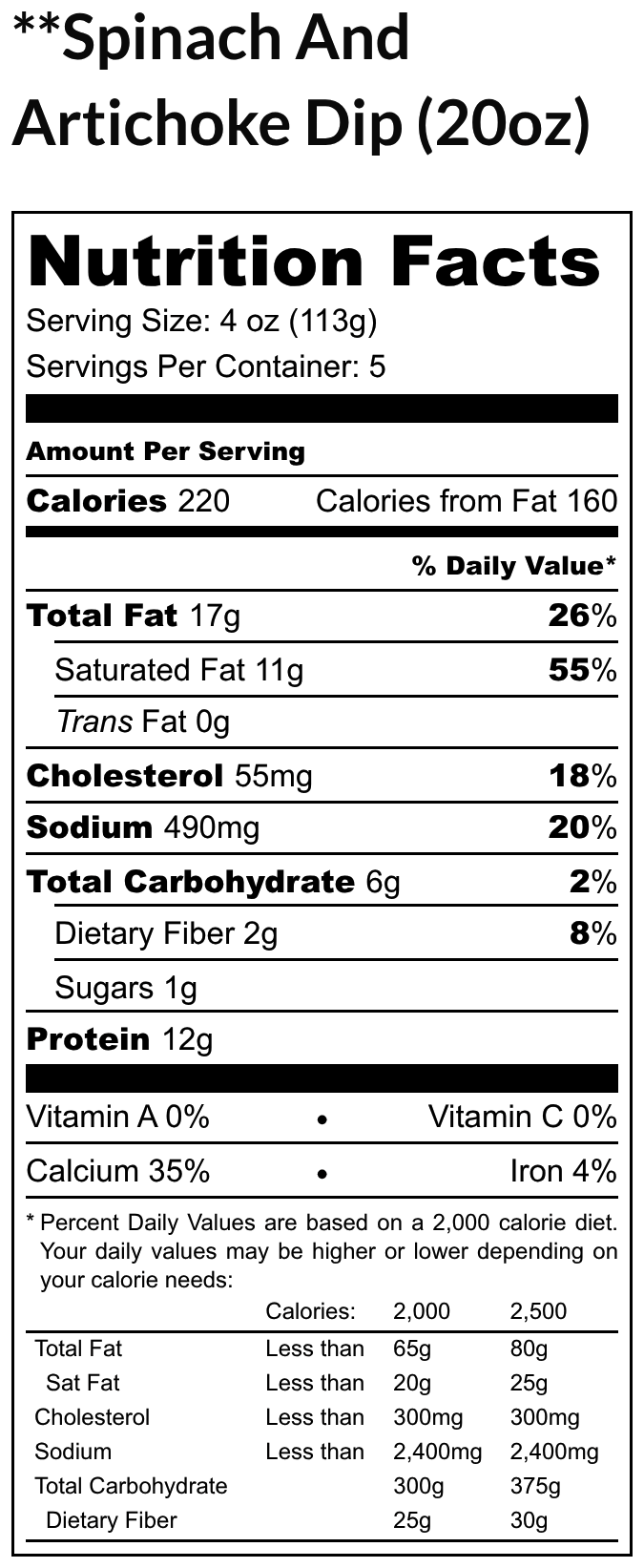Ingredients: Cream Cheese (milk, cheese cultures, salt), Artichokes, Spinach, Mozzarella (pasteurized milk, cheese culture, salt, enzymes), Parmesan (pasteurized milk, cheese cultures, salt, enzymes), Yogurt (milk, enzymes), Garlic