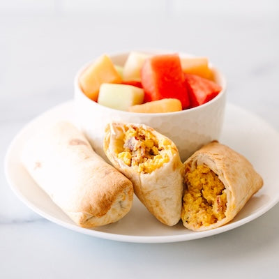 Ingredients: Egg, Flour Tortilla [enriched bleached wheat flour (wheat flour, niacin, reduced iron, thiamine mononitrate, riboflavin, folic acid), water, vegetable shortening (interesterified soybean oil, hydrogenated soybean oil and/or palm oil), contains 2% or less of: salt, sugar, leavening (sodium bicarbonate, sodium aluminum sulfate, corn starch, monocalcium phosphate, calcium sulfate), distilled monoglycerides, enzymes, wheat starch, calcium carbonate, antioxidants, cellulose gum, guar gum, dough conditioners, calcium propionate and sorbic acid], Bacon, Ham, Pork Sausage [pork, water, sausage seasoning (salt, dextrose, spices and spice extracts)], Cheddar [cultured pasteurized milk, salt, enzymes, annatto, anticaking blend (potato starch, cellulose, natamycin)], Milk (pasteurized reduced fat milk, vitamin A palmitate, vitamin D3), Salt, Pepper