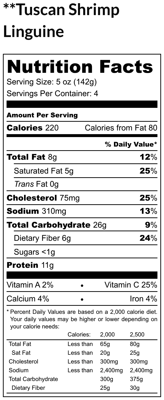 Ingredients: Pasta (durum wheat flour, semolina), Shrimp, Garlic Cream Sauce [heavy cream, butter, flour(unbleached hard red wheat flour, malted barley flour), garlic, sea salt, pepper], Roasted Red Peppers