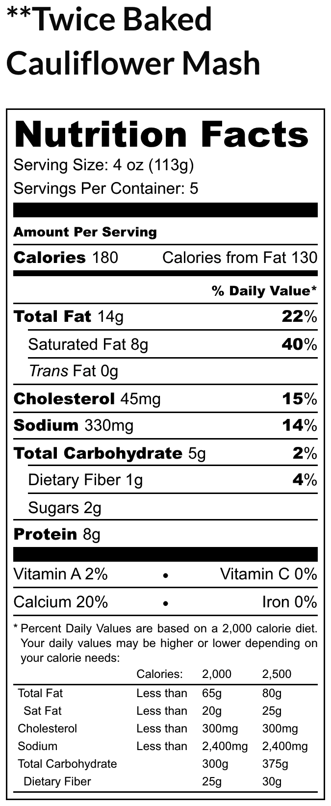 Ingredients: Cauliflower, Cheddar (cultured pasteurized milk, salt, enzymes, annatto, anticaking blend), Sour Cream (cultured cream, enzymes), Bacon, Butter, Cream Cheese (milk, cheese cultures, salt), Green Onions